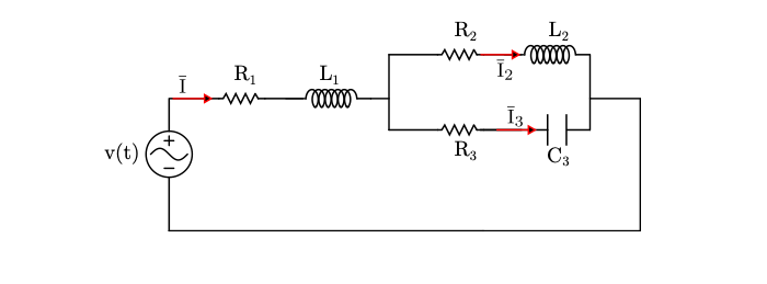 \[R_1 = 5\ \Omega \qquad R_2 = 250\ \Omega \qquad R_3 = 50\ \Omega\] \[L_1 = 5\ \text{mH} \qquad L_2 = 50\ \text{mH} \qquad C_3 = 500\ \mu\text{F}\]Given that the source voltage \(v(t) = 630\sqrt{2}\sin(2\pi 60t)\) V: